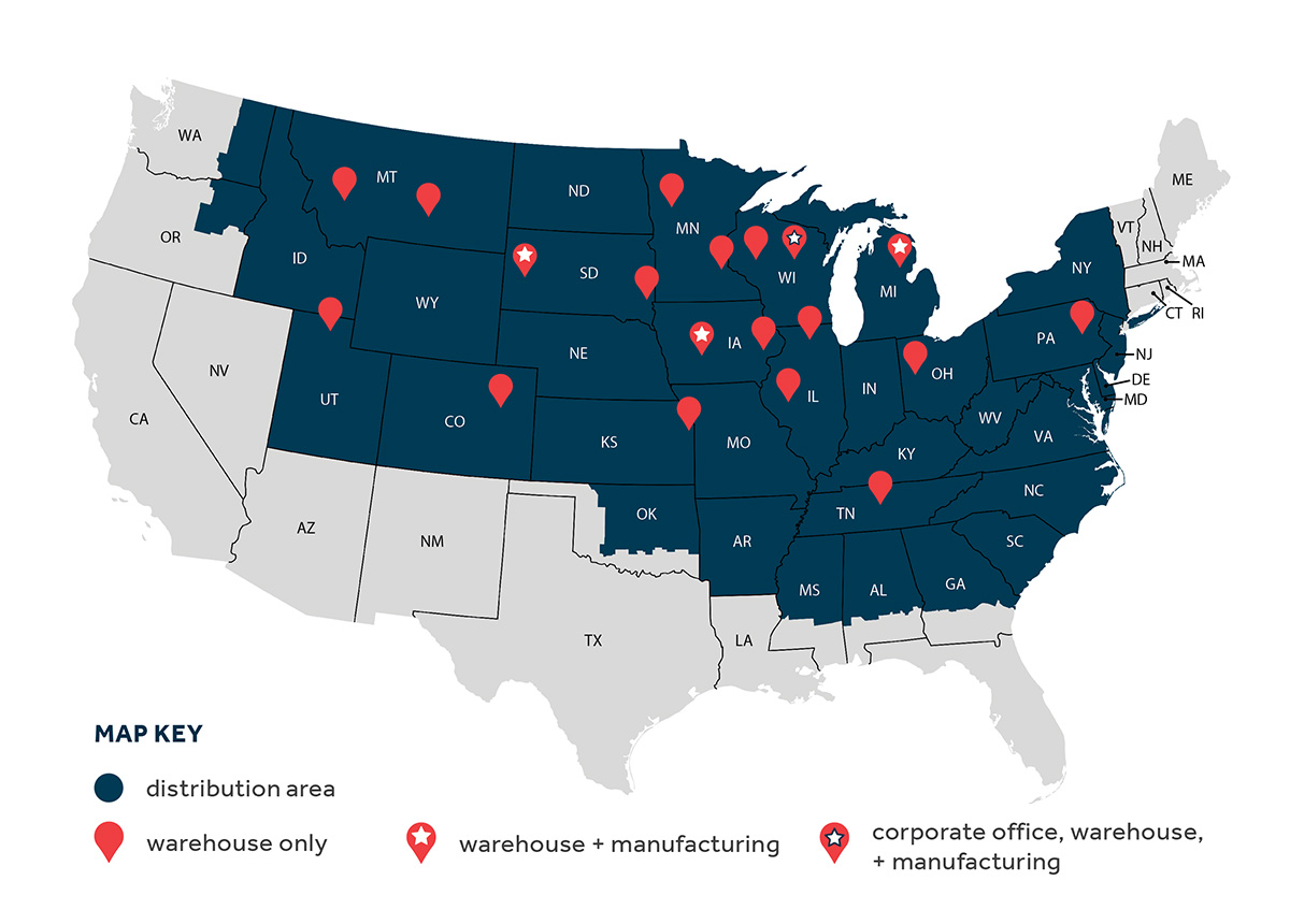Wausau Supply Co. was established in 1947 and has seen decades of growth in geography and product distribution. Our business is based on a diverse and progressive mix of two-step building material distribution and innovative manufactured brands. With 20+ warehouses and 6 manufacturing facilities, our geographical footprint extends from the Pacific West Coast to the East Coast. Our partnerships with building material manufacturers allow us to distribute quality products to retail centers throughout the United States.